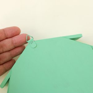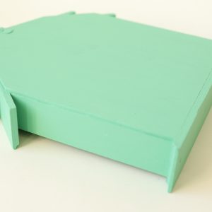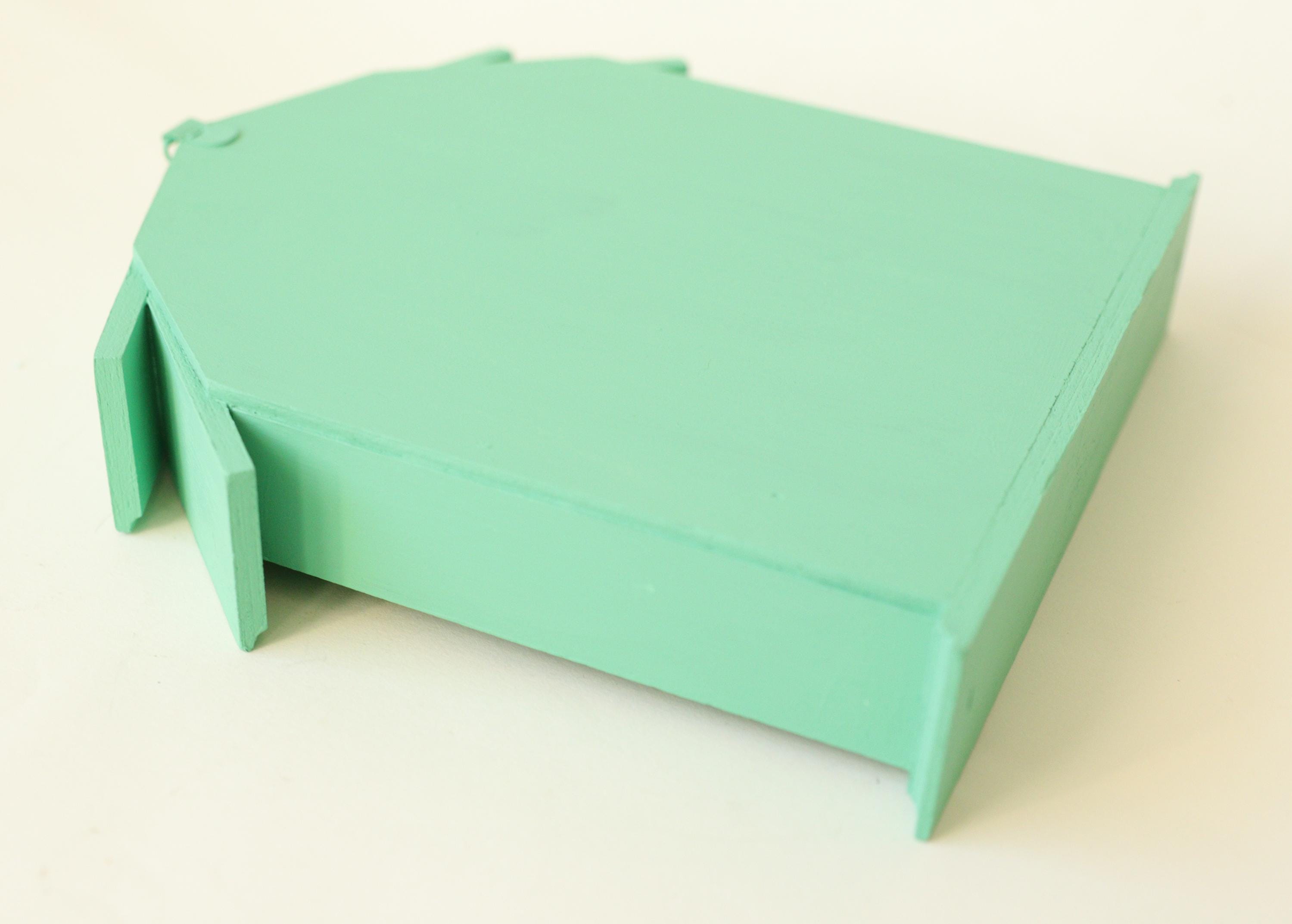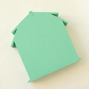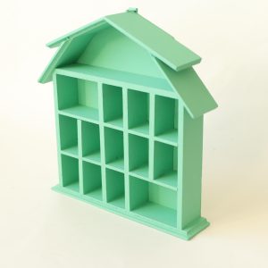 This wooden trinket house shelf has been painted by me with a jade green! Measures 7×7” and 1” deep.